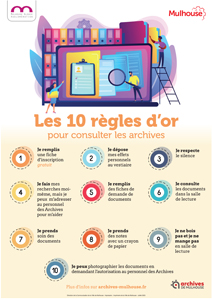 Les archives municipales de la Ville de Mulhouse sont ouvertes ; les usagers sont invités à prendre rendez-vous par téléphone : 03 89 32 69 63.