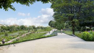 - Une passerelle installée à l’été 2021 entre le quai des Pêcheurs et le quai des Cigognes favorise la liaison avec les quartiers alentours. L’eau retrouvera également sa place au sein du quartier Fonderie avec l’ouverture d’un ancien bras de l’Ill.